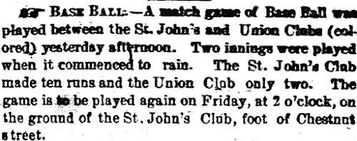 On Tuesday, October 23, 1855, a baseball game was played at the foot of Chestnut Street in Newark, not far from today's Penn Station. While the Newark Daily Mercury called the field one of the teams' home field, it was likely little more than a vacant lot (and apparently remains so today). With two innings in the books, the St. John's Club held a 10-2 lead over the Union Club, but it began to rain, ending the day's play. Since both sides were likely playing mostly for fun, the losing Union Club was probably just as disappointed as the winning St. John's team. According to the Mercury, the game was to replayed that Friday at the same ground which was the St. John's Club's home field. No report of the rescheduled game or any other mention of the two teams has been found so we know very little about them and are not likely to find anything more. In most cases, the game and the teams would be forgotten, were it not for one word in the four sentence article - the insensitive nineteenth century adjective "colored," where today we would say African-American or black. That one word, however, makes this an historic event because, as of this writing, it is the earliest known instance of African-Americans organizing to play baseball anywhere in the United States.